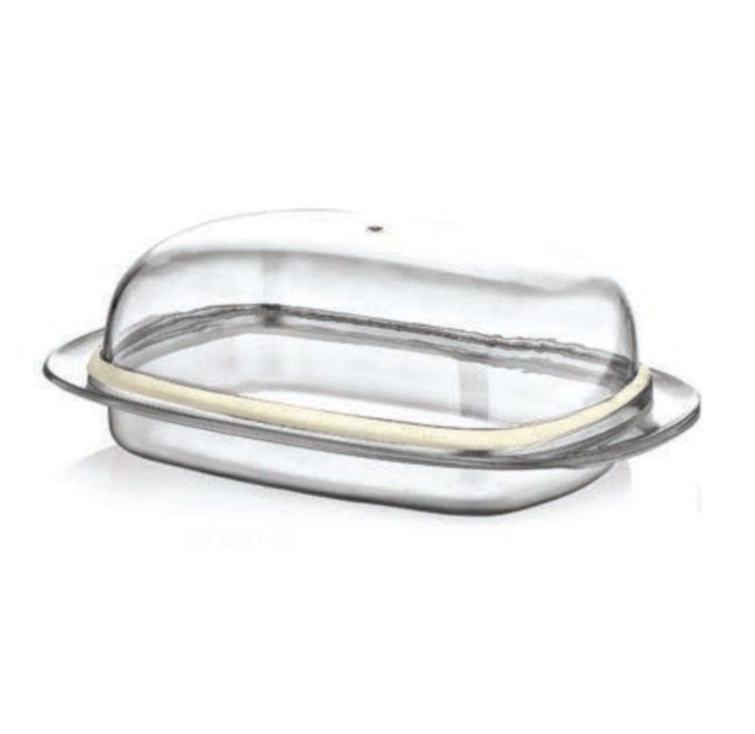 Mantequillera, compuesta por una práctica base y una bella campana transparente, su tamaño adecuado y su práctico diseño la convierten en un objeto de uso funcional y fácil de guardar.